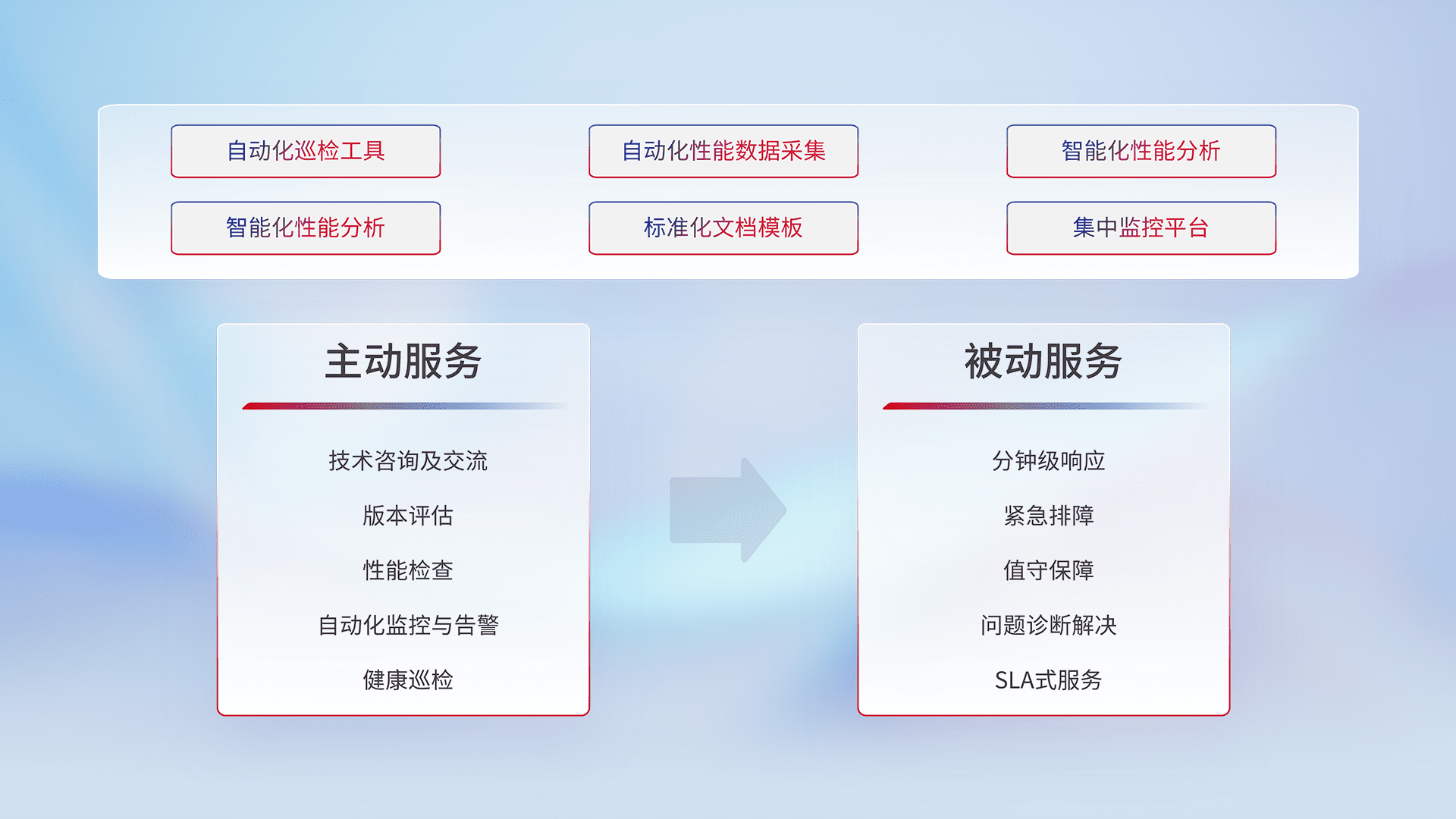 智能化工具和标准化文档,,,保障服务质量,,,,提供主动服务(包含技术咨询、、、、版本评估、、、、性能检查、、、自动化监控与告警、、、健康巡检)和被动服务包含(分钟级响应、、紧急排障、、值守保障、、问题诊断解决、、SLA服务)。。。。